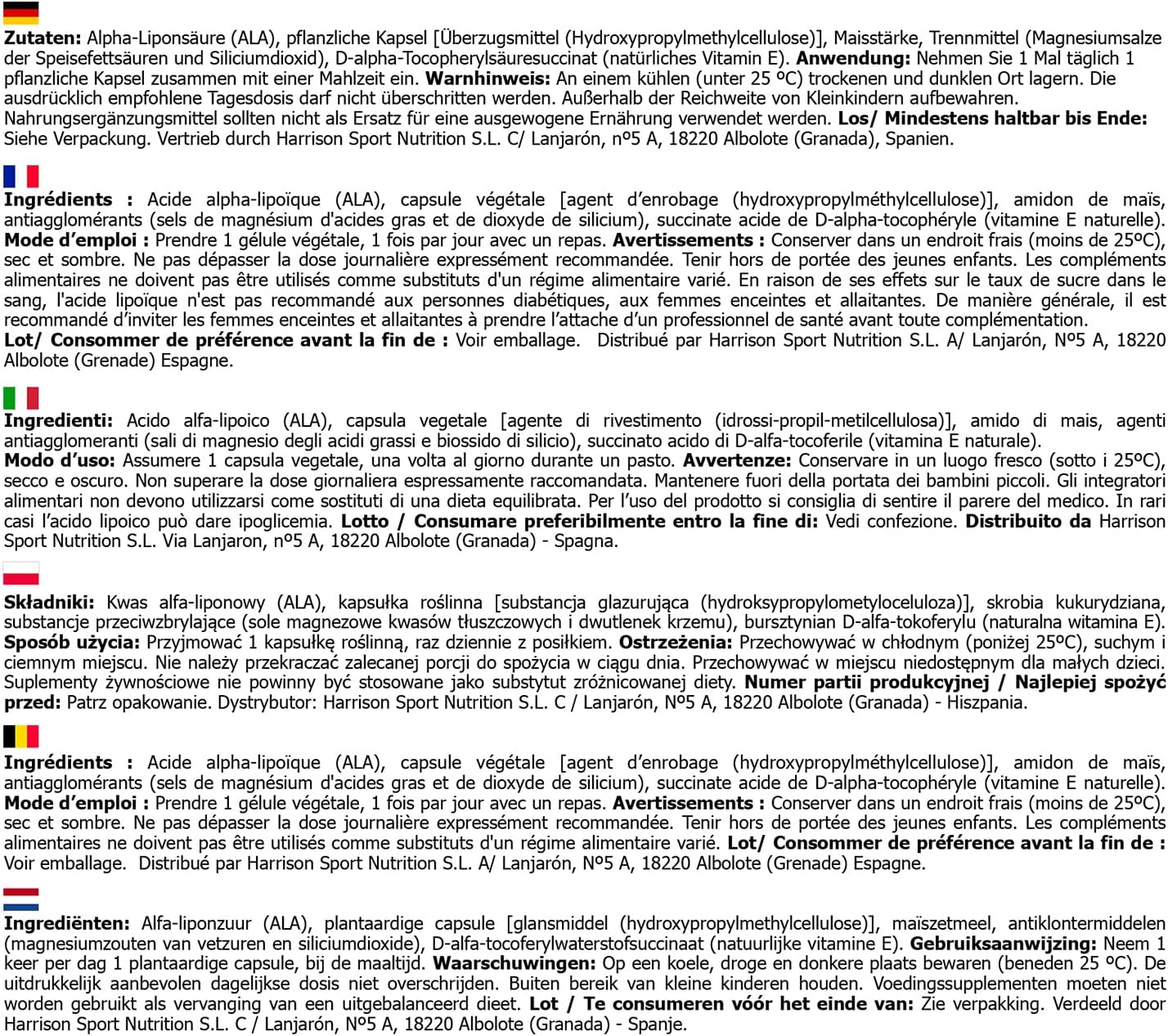 - Elaborado con Ácido Alfa-Lipoico (mezcla racémica R-/S-) y Vitamina E.